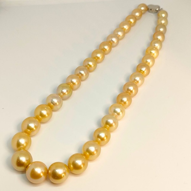 # ゴールドパール 10.3~13.7㎜ ネックレス 希少で美しいゴールドパールを贅沢に使用したネックレスです。パールのサイズは10.3㎜から13.7㎜まであり、自然なグラデーションが生み出すエレガントな輝きが特徴です。ゴールドパール特有の温かみのある光沢が、身に着ける人の魅力を一層引き立てます。 フォーマルな場面から特別な日の装いまで幅広く活躍するこのネックレスは、華やかさと上品さを兼ね備えたデザインです。大切な方へのプレゼントとしても喜ばれる、洗練された一品をぜひご自身のコレクションに。 素材:K18(チェーン) 詳細:ゴールドパール(10.3~13.7㎜) チェーンの長さ:45㎝ ※チェーンも付属した商品になります。 ■ お手入れ・取り扱い注意事項 - 柔らかい布で優しく拭いてください。 - 水や化学薬品に触れさせないようご注意ください。 - 保管場所は高温・直射日光を避けてください。 ■ 発送・注文に関する情報や注意事項 - 通常、注文から2~3営業日以内に発送します。 - 在庫状況により発送が遅れる場合がありますので、予めご了承ください。 ご質問やご不明な点があれば、ショップのお問い合わせからお気軽にお知らせください。この美しいネックレスが、あなたの日常に特別な輝きを添えられますように。