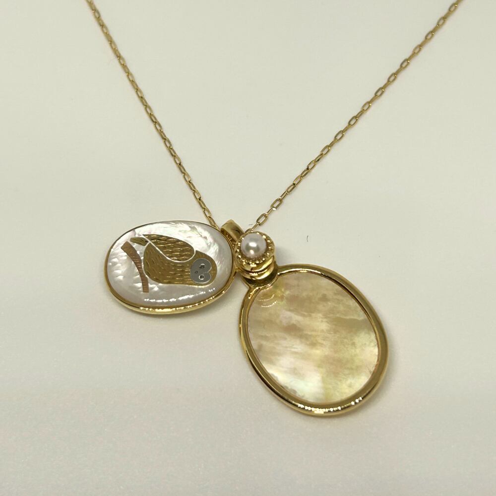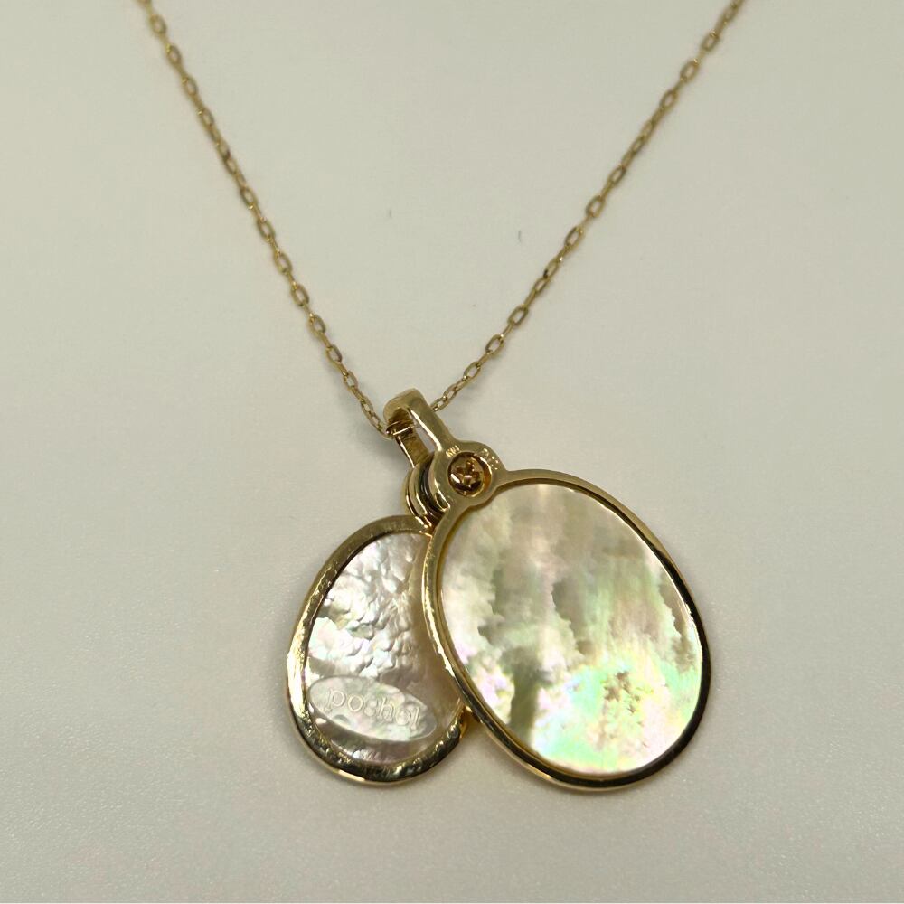 優雅な白蝶貝を使用したスイングネックレス。18Kゴールドの温かみのある輝きが、白蝶貝の持つ優雅な美しさを引き立て、洗練された印象を与えます。その独特のデザインは、特別な日のおしゃれはもちろん、日常のコーディネートにも上品なアクセントをプラスする逸品です。