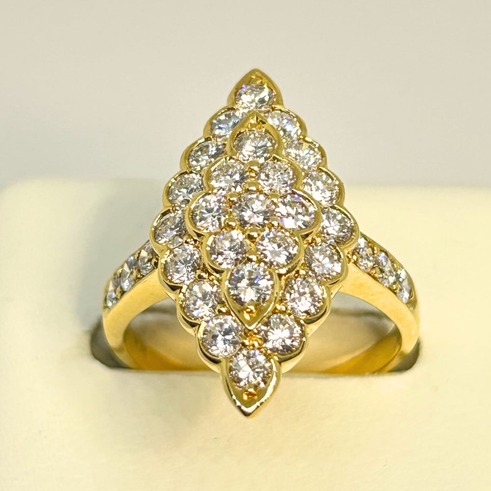 煌めくダイヤモンドを2.25ctも贅沢に使用したリング。K18ゴールドの温かい輝きが、ダイヤモンドの美しさを一層引き立て、洗練された印象を与えます。その気品あふれるデザインは、特別な日の装いや普段のコーディネートにも素敵なアクセントをプラスする逸品です。