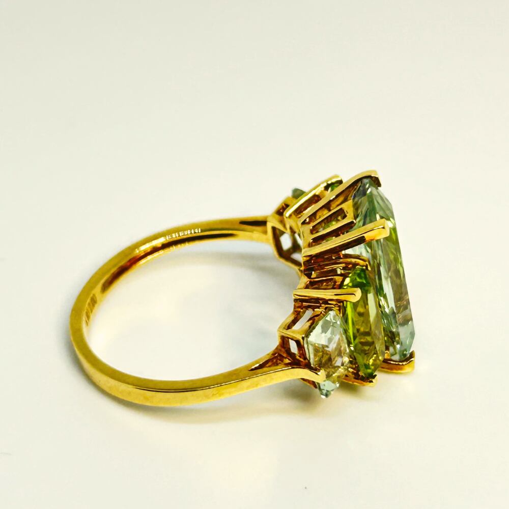 華やかに輝くクオーツ4.8カラットと色鮮やかなペリドット2カラットを使用したリング。K18ゴールドの贅沢な輝きが、クオーツの透明感とペリドットの明るさを引き立て、洗練されたデザインは特別な日の装いや日常のコーディネートに素敵なアクセントを加える逸品です。